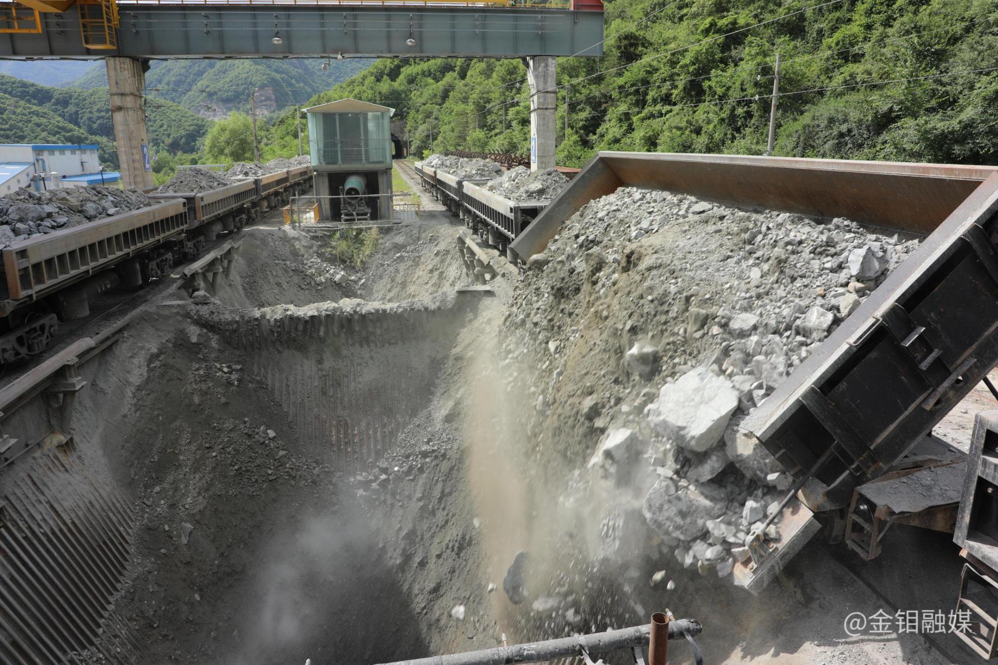 電機(jī)車(chē)正在向礦倉(cāng)翻卸礦石