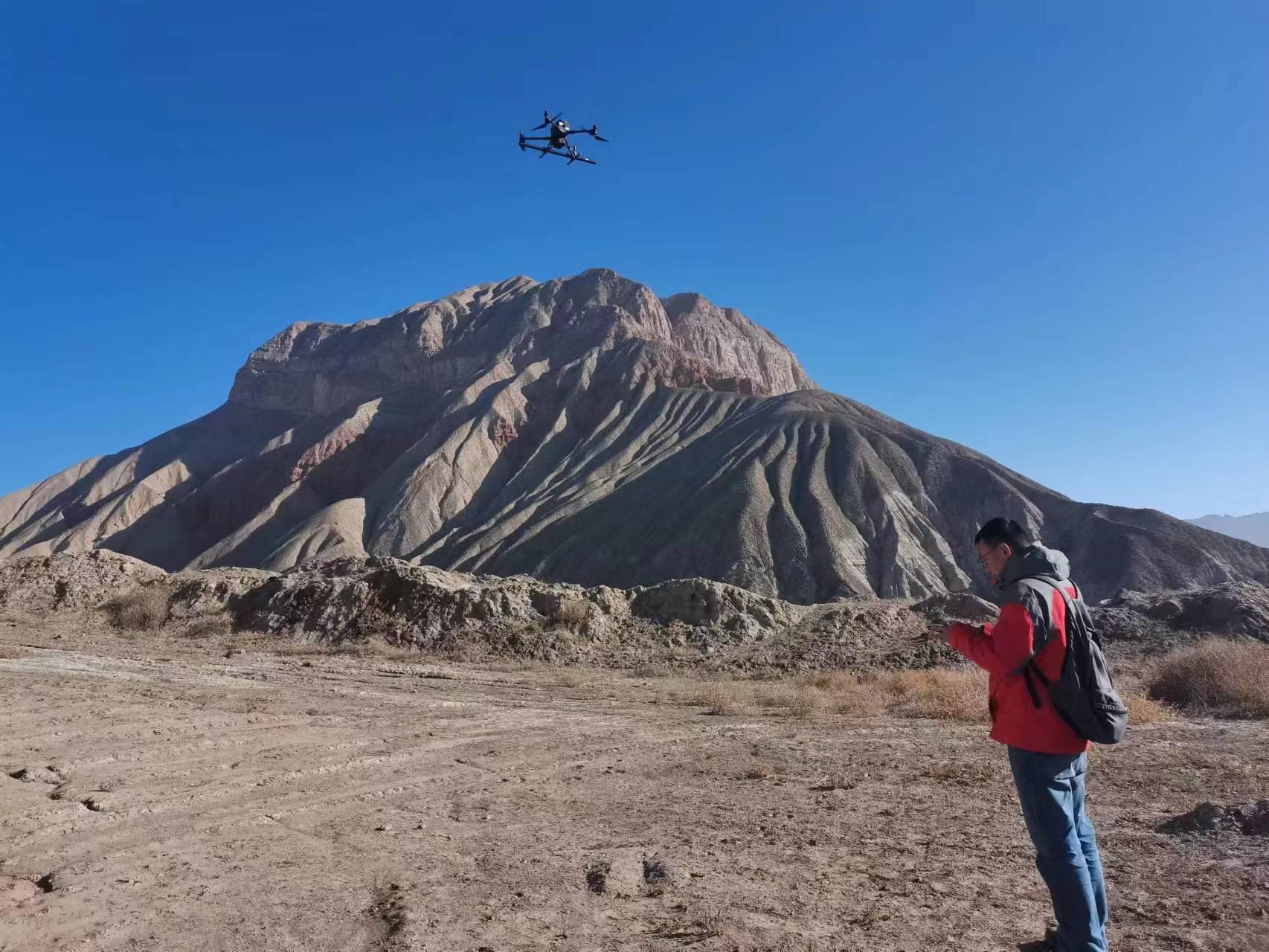 ▲新疆喀什煤田火燒區(qū)探測項(xiàng)目飛手正在進(jìn)行低空航磁數(shù)據(jù)采集