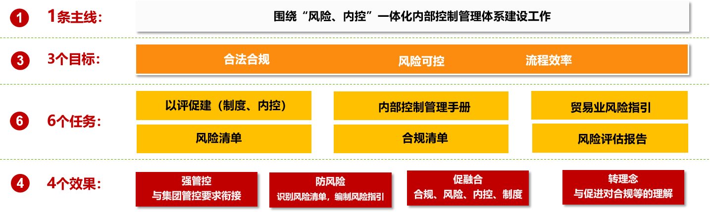 高標(biāo)準(zhǔn)規(guī)劃:緊扣“風(fēng)險(xiǎn)、內(nèi)控一體化建設(shè)”這一主線,按照“1364”思路系統(tǒng)推進(jìn)——錨定合法合規(guī)、風(fēng)險(xiǎn)可控、管控高效三大目標(biāo),一體完成內(nèi)控診斷報(bào)告、風(fēng)險(xiǎn)清單、合規(guī)清單、風(fēng)險(xiǎn)評估報(bào)告、內(nèi)部控制手冊、貿(mào)易業(yè)務(wù)風(fēng)險(xiǎn)指引六項(xiàng)任務(wù),全面達(dá)成強(qiáng)管控、防風(fēng)險(xiǎn)、促合規(guī)、轉(zhuǎn)理念四項(xiàng)成效,為企業(yè)高質(zhì)量發(fā)展筑牢堅(jiān)實(shí)屏障。