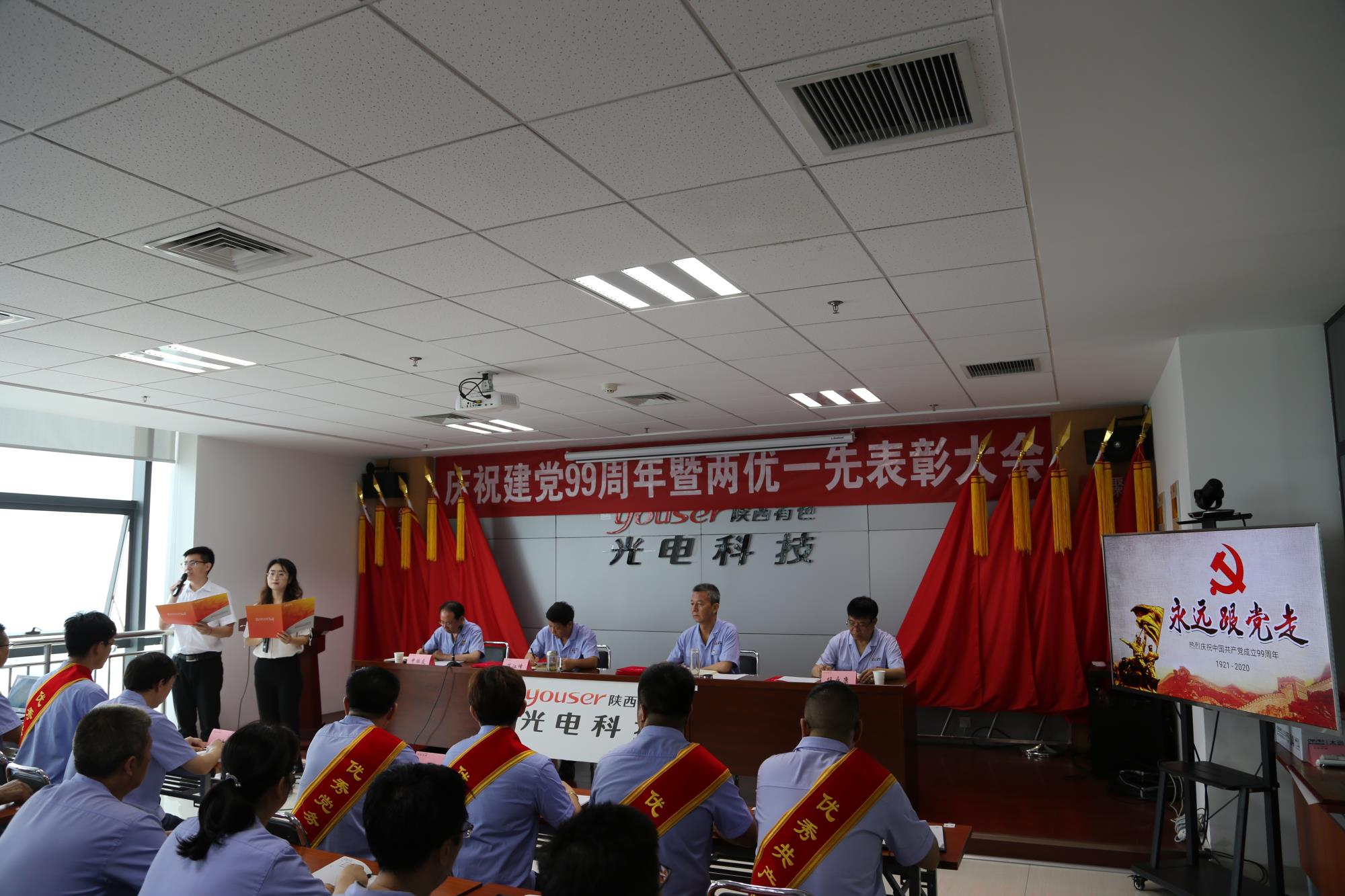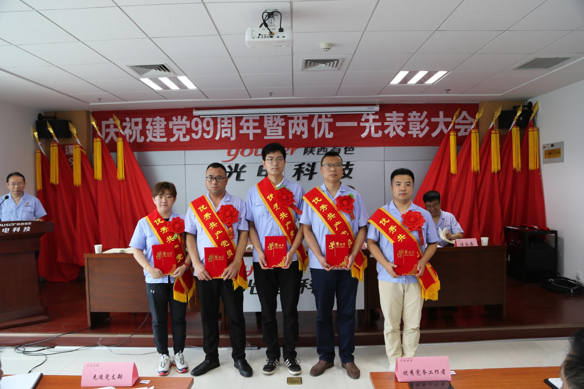 7月1日上午,光電科技、華山半導(dǎo)體兩公司在研發(fā)大廈六樓會議室召開慶祝建黨99周年暨兩優(yōu)一先表彰大會,公司領(lǐng)導(dǎo)、全體中層干部,先進黨員、預(yù)備黨員、老黨員代表近80人參加會議,黨委副書記申振友主持會議。