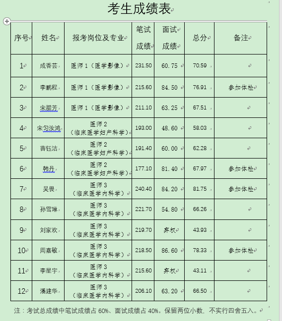 西北有色醫(yī)院2021年省屬事業(yè)單位公開(kāi)招聘面試環(huán)節(jié)已經(jīng)結(jié)束,依據(jù)《事業(yè)單位人事管理?xiàng)l例》《陜西省事業(yè)單位公開(kāi)招聘工作人員實(shí)施辦法》及2021年陜西省省屬事業(yè)單位公開(kāi)招聘工作人員公告要求,考試總成績(jī),按照與崗位招聘計(jì)劃1:1的比例從高分到低分確定參加體檢人員。現(xiàn)將有關(guān)事項(xiàng)公告如下: