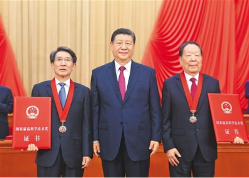 儀式號(hào)角響起,習(xí)近平首先向獲得2023年度國(guó)家最高科學(xué)技術(shù)獎(jiǎng)的武漢大學(xué)李德仁院士和清華大學(xué)薛其坤院士頒發(fā)獎(jiǎng)?wù)?、證書,同他們熱情握手表示祝賀。隨后,習(xí)近平等黨和國(guó)家領(lǐng)導(dǎo)人同兩位最高獎(jiǎng)獲得者一道,為獲得國(guó)家自然科學(xué)獎(jiǎng)、國(guó)家技術(shù)發(fā)明獎(jiǎng)、國(guó)家科學(xué)技術(shù)進(jìn)步獎(jiǎng)和中華人民共和國(guó)國(guó)際科學(xué)技術(shù)合作獎(jiǎng)的代表頒發(fā)證書。