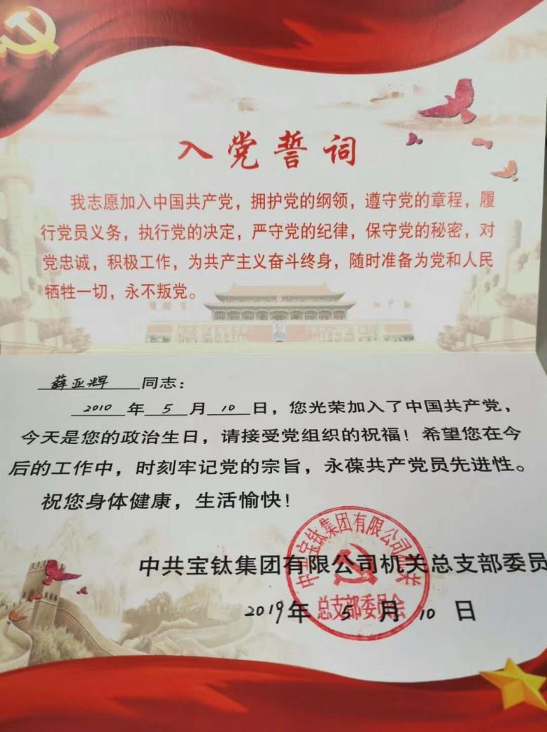 近日,寶鈦集團機關(guān)黨總支開展為黨員過“政治生日”活動。從5月份起,在黨員入黨日當天,由機關(guān)黨支部向黨員贈送“政治生日賀卡”,重溫入黨誓詞,開展談心談話?!罢紊召R卡”不僅印制了入黨誓詞、習(xí)近平總書記對黨員提出的“四講四有”的要求,還有機關(guān)總支的衷心祝福和殷切希望。