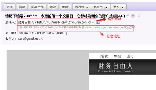 辨別釣魚(yú)郵件,首先關(guān)注來(lái)郵的地址信息。電子郵件與常規(guī)郵件類似,其發(fā)信人地址可以分為信封地址和信息地址,信封地址是發(fā)件人聲稱的地址,由發(fā)件人自己填寫(xiě);而信息地址為郵件服務(wù)器記錄的實(shí)際地址。從而可見(jiàn),信封地址是可以偽造的,而用戶往往看到的就是發(fā)件人的信封地址(可以將光標(biāo)移至發(fā)件人或信封地址后面查看是否有地址不一致的提示)。一般來(lái)說(shuō)一封正常的電子郵件應(yīng)該是信息地址和信封地址是相同的,如果不同,或標(biāo)記“代發(fā)”的,就要特別小心,可以初步判斷可能是一封偽造郵件,也就是可能是釣魚(yú)郵件。例如以下這封郵件: