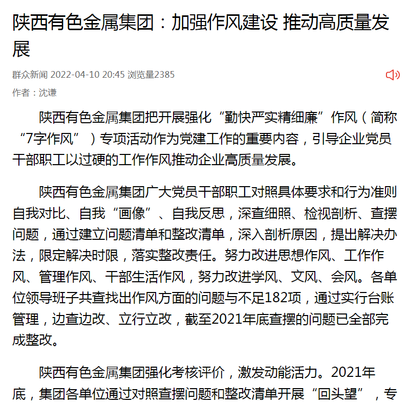 陜西有色金屬集團把開展強化“勤快嚴實精細廉”作風(簡稱“7字作風”)專項活動作為黨建工作的重要內容,引導企業(yè)黨員干部職工以過硬的工作作風推動企業(yè)高質量發(fā)展。