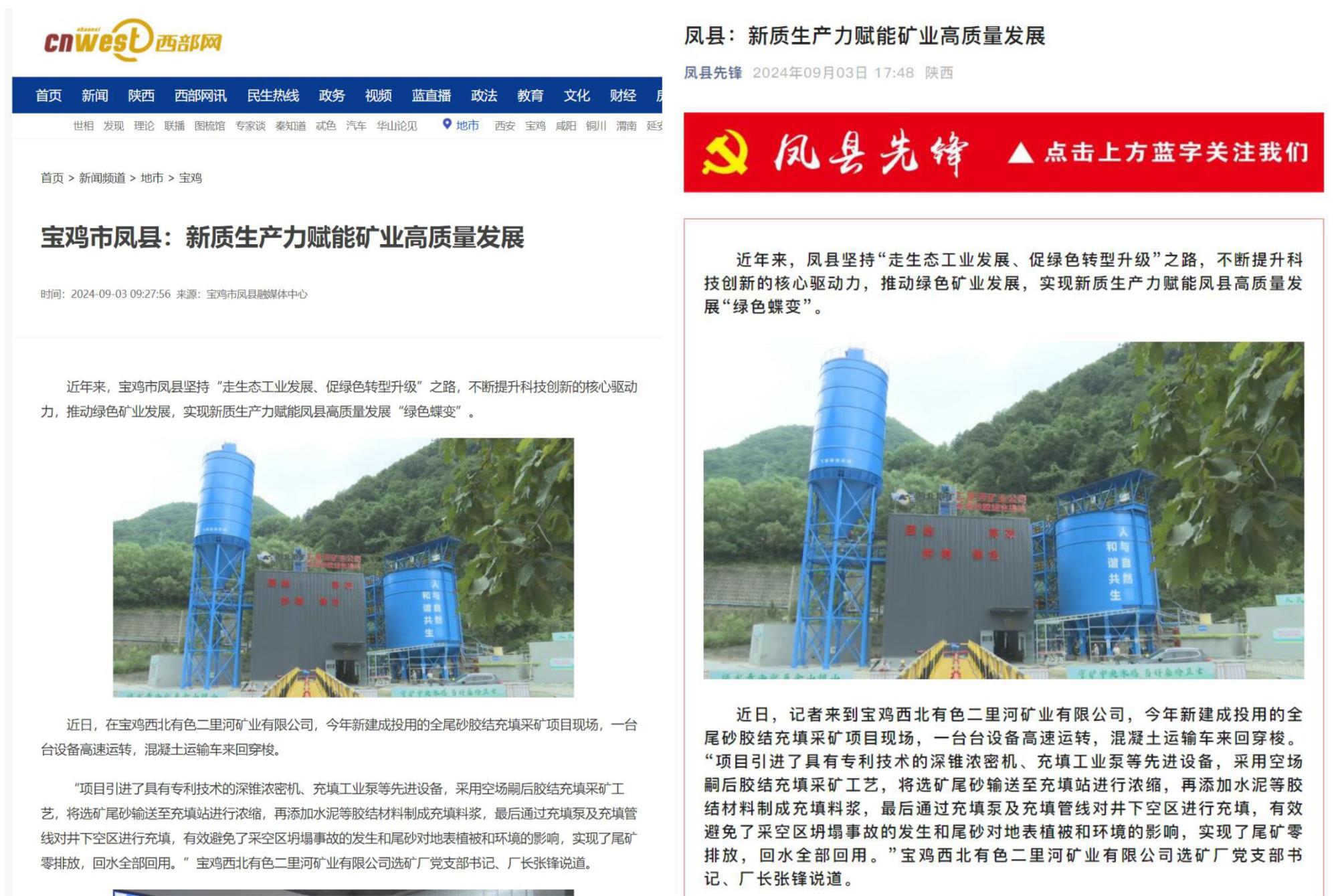近日,中國(guó)報(bào)道、西部網(wǎng)、西北信息報(bào)、寶雞市鳳縣融媒體中心、鳳縣先鋒等主流媒體,以《鳳縣:新質(zhì)生產(chǎn)力賦能礦業(yè)高質(zhì)量發(fā)展》為題,集中報(bào)道了地礦集團(tuán)權(quán)屬鉛鋅集團(tuán)寶雞各礦山企業(yè)和銀母寺礦業(yè)公司以綠色發(fā)展促進(jìn)新質(zhì)生產(chǎn)力躍升、賦能鳳縣社會(huì)經(jīng)濟(jì)高質(zhì)量發(fā)展的經(jīng)驗(yàn)做法。全文如下: