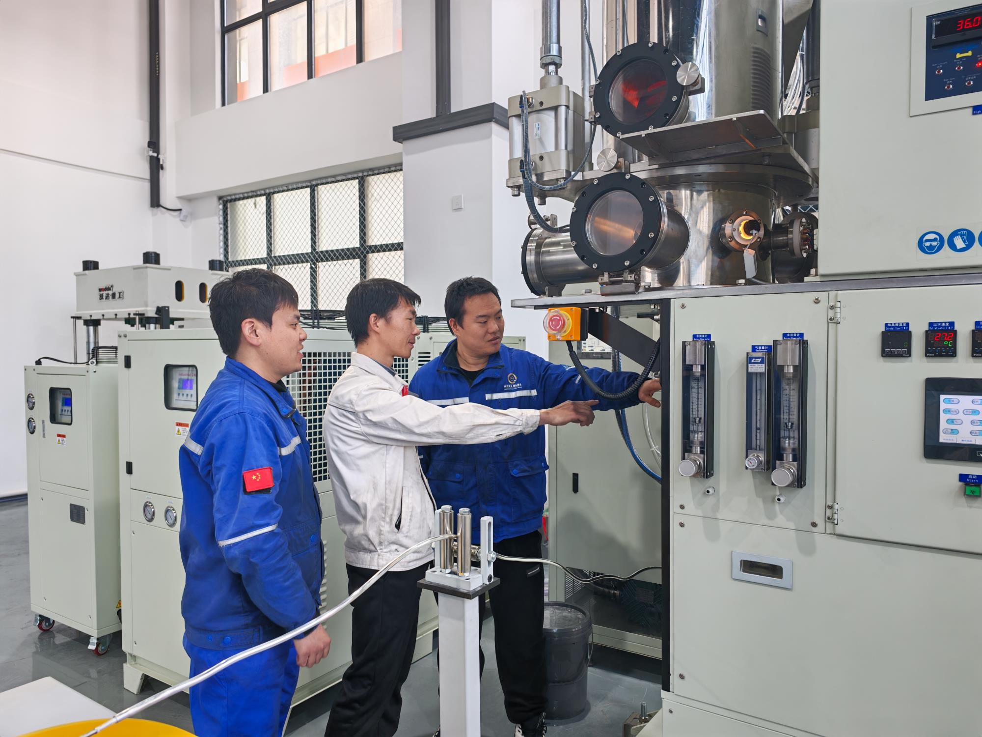 近日,走進(jìn)西安鄠邑區(qū)的黃金集團(tuán)西安秦金公司年產(chǎn)25噸貴金屬壓延類新材料項(xiàng)目過渡廠房,技術(shù)人員在設(shè)備廠家的指導(dǎo)下,對(duì)黃金連續(xù)真空熔鑄、清洗、自動(dòng)化打標(biāo)及碼垛等進(jìn)行反復(fù)調(diào)試,隨著1#、2#標(biāo)準(zhǔn)金錠和100克金條順利產(chǎn)出,標(biāo)志著該項(xiàng)目黃金壓延類產(chǎn)線聯(lián)動(dòng)調(diào)試成功,隨時(shí)可進(jìn)入試生產(chǎn)階段。