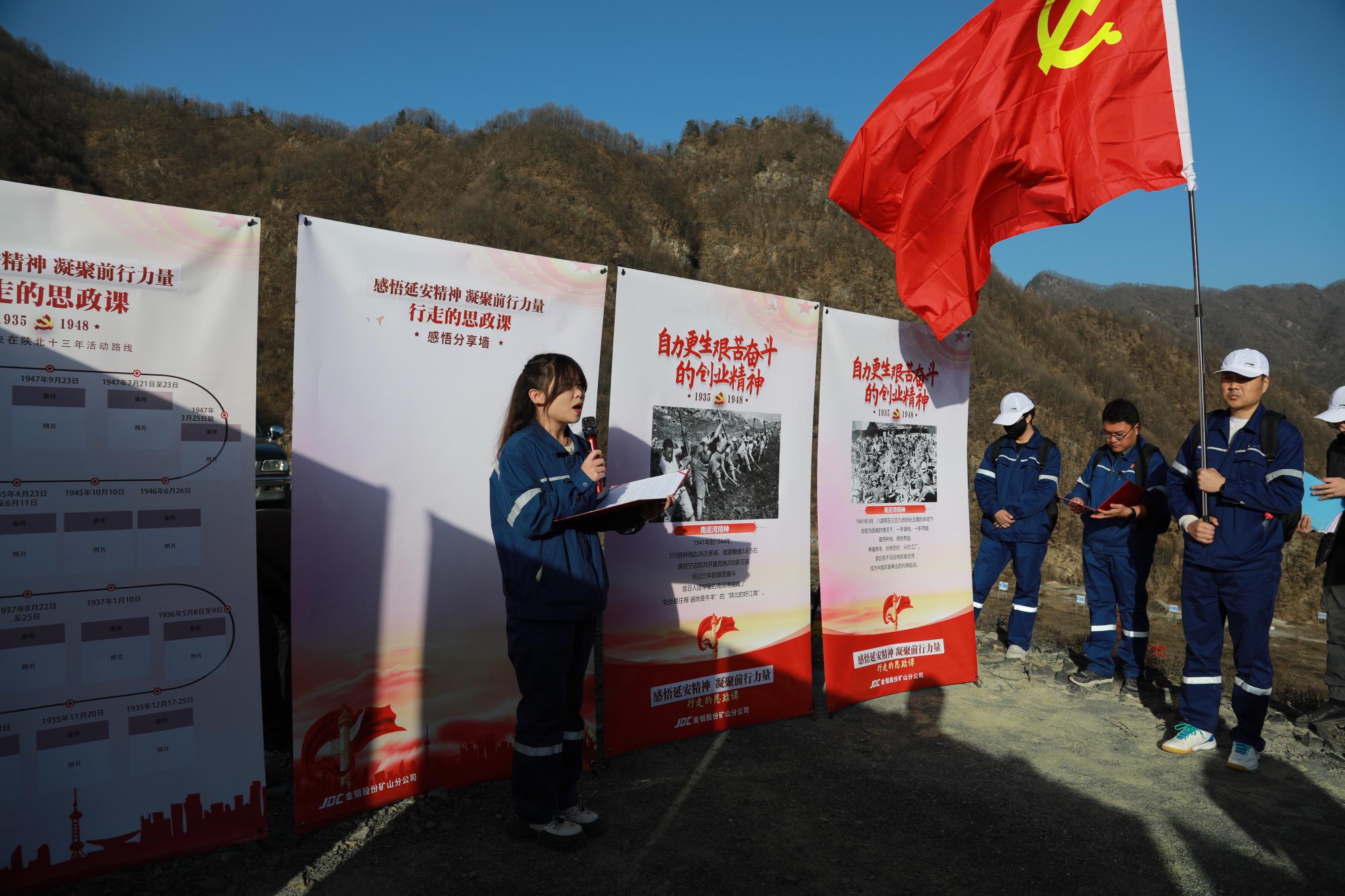 為確保思政課取得實實在在成效,金鉬集團礦山分公司黨委提前籌劃,精心準備,在總長約6公里的木子溝尾礦庫沿途,設置4個集合點,放置“堅定正確的政治方向、解放思想實事求是的思想路線、全心全意為人民服務的根本宗旨、自力更生艱苦奮斗的創(chuàng)業(yè)精神”四塊紅色展板,通過場景模擬、現(xiàn)場講述等方式,系統(tǒng)回顧在百年黨史中熠熠生輝的延安精神,滋養(yǎng)初心、淬煉靈魂。