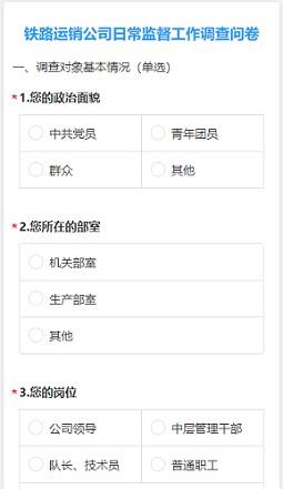 在一線走訪的基礎(chǔ)上,鐵路運銷公司于721-729日組織開展為期一周的“日常監(jiān)督工作”線上調(diào)查問卷活動。問卷設(shè)計8個單選題、8個多選題和1個主觀題,內(nèi)容涵蓋鐵路運銷公司日常監(jiān)督工作基本情況、日常監(jiān)督工作范圍、監(jiān)督對象及需要改進的地方等多方面問題。鐵路運銷公司近50余人參與答卷,通過線上匿名問卷調(diào)查的方式,對鐵路運銷公司日常監(jiān)督工作的落實和開展情況進行“內(nèi)部體檢、內(nèi)部自查”,為進一步完善和加強后期日常監(jiān)督工作奠定堅實基礎(chǔ)。