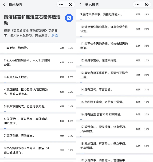 為了深入推進(jìn)“清廉有色”建設(shè),推動(dòng)“清風(fēng)潤煤業(yè)·廉潔促發(fā)展”系列活動(dòng)扎實(shí)開展并取得實(shí)效,近日,榆林新材料煤業(yè)公司紀(jì)委組織開展廉潔格言和廉潔座右銘征集活動(dòng),并采取線上投票的方式對(duì)報(bào)送的36條優(yōu)秀格言進(jìn)行評(píng)選,最終評(píng)選出“心底無私天地寬,利欲熏心路難行”、“心無私欲自然會(huì)剛,人無邪念自然公正”兩條優(yōu)秀廉潔格言。這一活動(dòng)不僅讓黨員干部承諾踐諾,更讓廣大職工群眾充分參與進(jìn)來,在公司范圍內(nèi)形成人人參與清廉文化建設(shè)、共筑廉潔防線的良好氛圍。